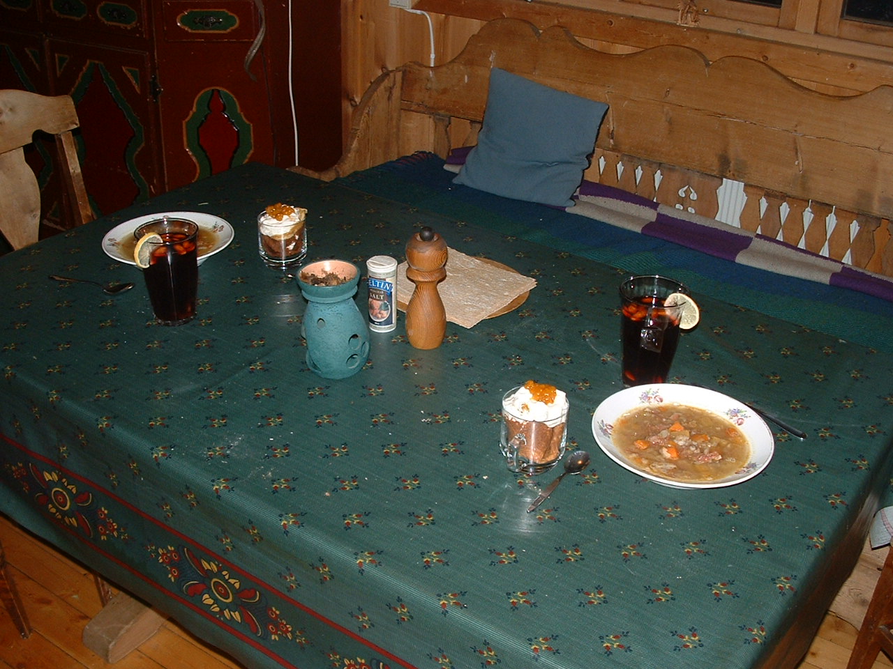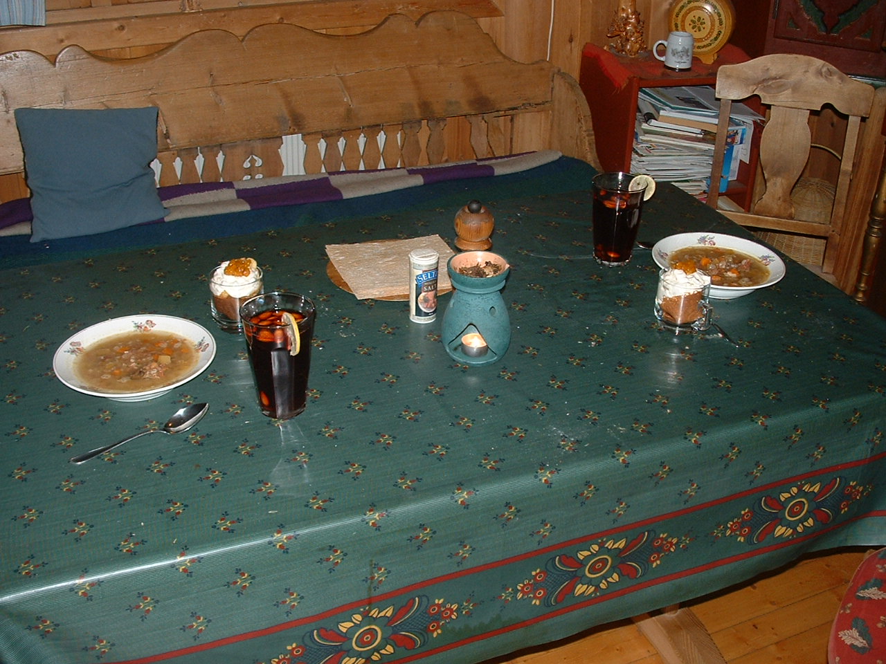 The most special Xmasdinner during my lifetime ! This year Tor Magne decided that we ought to eat what was left of the "Majel" from yesterday. SO BE IT ! [PS: the recipe in the link says lambs meat - but the traditional is leftovers from salted & dried ham - and pearl barley, of course!]- The 'Majel' was accompanied with flatbread and 'Gløgg' - followed by 'Moltekrem' in freshbaked (this morning) 'Strylle" [Krumkake]. At least the dessert is traditional in the household on Dec. 24.! Uvanleg traktement til julekveldsmiddag dette året ! Kanskje var vi dei einaste i kongeriket som hadde denne menyen på julekvelden. Hovudrett: Majelsuppe med flatbrød - og Gløgg til drikke. Måltidet slutta på meir tradisjonell måte - Moltekrem i fersksteikte stryller. |