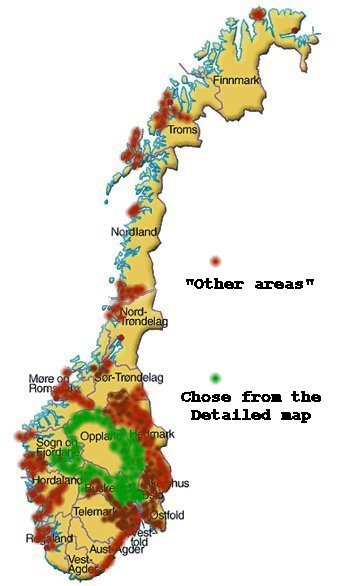 Her finn du to ulike sorteringar av listene To lister er tilgjengelege for område der ein ikkje ventar å finne mange Valdrisar som brur eller brudgom . - Ser vi på kartet til venstre, er dei områda eg har gått gjennom kyrkjebøkene for, markert med brun farge. (Det grøne området viser til det hyperlenka kartet for granneområde til Valdres). Desse listene har også med sume hyperlekkjer til Folketeljingane frå 1865, 1875 og 1900. Listene er sortert etter A) Geografisk område (Kommunenummer) - og - B) Årstal (Dato) for vigsla Om kommunenummer - samt - Historiske kart finn de her: --------------------------------------------- You might dive into the information from two directions The data for the areas where I did not expect to find many brides or bridegrooms from Valdres can be found in two different lists. The brown markings on the left hand map gives you an idea of which areas I have covered, the green marking relates to the detailed map of the neighbour areas of Valdres. The lists have some hyperlinks to the Censuses from 1865, 1875 and 1900. Lists are sorted by: A) Geograpic area (Kommunenumber) - og - B) Year (Date) for the wedding Information on "Kommunenumber" - and - historical development (mars) |