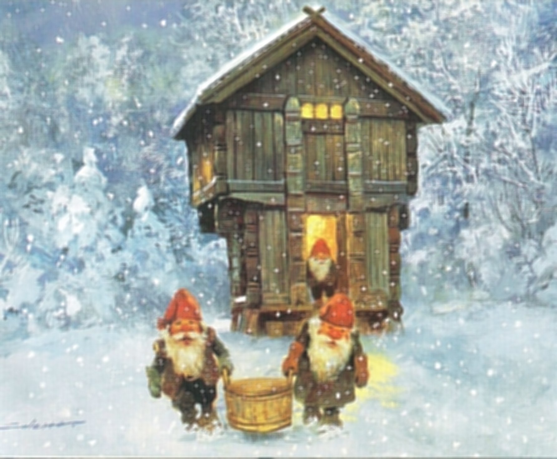 Julekortet er kalla "Julegrøt". Det vart motteke 1999 og er merka Svein Solem (C) Ulf Hultin Förlag. Visitors from the "stabbur" arriving with porridge and visitors in the Månostabbur came in the wrong time of the year to meet the porridgecarrying inhabitants.