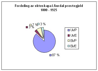In the timespan I have investigated, abt. 11 100 marriages has been reported in the Churchbooks. If we compare the parishes, all has close to the same percentages for marriages with a spouse from outside the region, while Aurdal differs quite a lot on the percantage of marriages across it's parish border. Tabellen til venstre syner at prosentdelen av ekteskapa der ein part kjem utanfrå Valdres er om lag den same i alle tre gamle prestegjeld. Ser ein på giftarmål over prestegjeldsgrensene er prosentdelen for Aurdal berre halvparten så stor som i Vang og Slidre. |